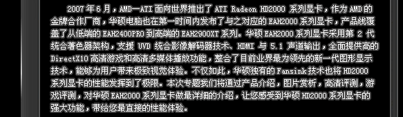 除了HD2000系列显卡众所周知的、优秀的HDTV解码能力,华硕靓彩(Splendid)图像增强技术也给人留下了深刻的印象。华硕靓彩(Splendid)图像增强技术的主要作用是增强图像的光影效果,在一定程度上增加了亮度、色彩、对比度等图像显示要素,使得画面色彩更艳丽、更柔和,尤其是在光影效果上... >>> | ![]() |