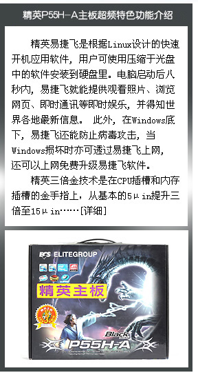 这款P55主板是精英“黑尊龙”系列中的一员,主板虽然并没有太强调豪华的用料,但是朴素和实用对于主流玩家才是最为重要的,主板在稳定性和扩展性方面都不错,并且其性价比优势也很高,而其1299元的价格……[详细] |