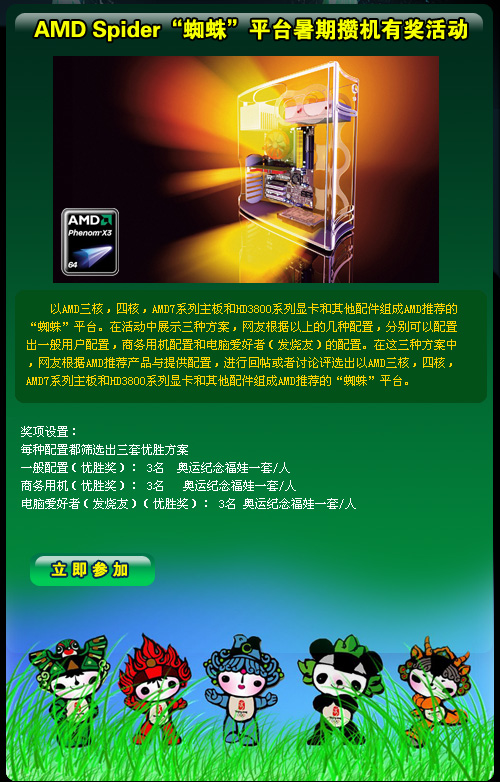 2007年底,整合ATI后平台优势渐显的AMD,在继大放异彩的690G芯片组之后,又走出了全平台整合的实质性一步:全球正式发布“Spider”平台。“Spider”平台主要是由三部分组成,其中微处理器部分是Phenom。Phenom有一个很大气的中文名:羿龙,代表着追求极限、超越梦想的浪漫主义精神。Phenom是AMD的天使。在K8架构行将退役,酷睿攻势迅猛步步进逼之际,AMD着实需要一款利器。