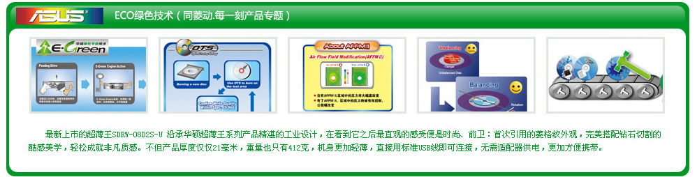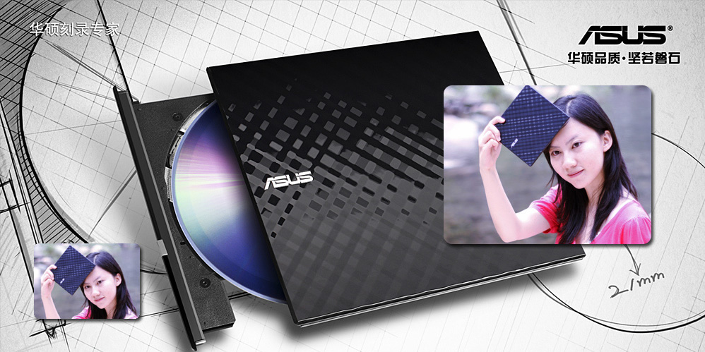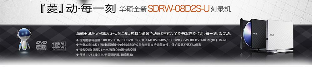 随着笔记本、上网本、Eee PC等便携电子设备的普及,外置超薄光驱逐渐受到人们的喜爱。作为拥有悠久历史和光荣传统的华硕超薄王家族,近日再携新品上市,超薄王SDRW-08D2S-U,延续之前SDRW-08D1S-U的优秀刻录品质,面板设计升级,采用更加奢华的菱格纹外观,外出携带,酷感十足!