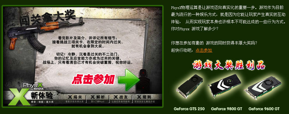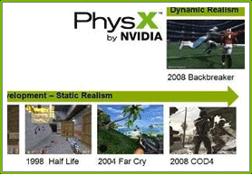 | 当时的PhysX 是AGEIA公司开发的一套物理运算引擎。在2004年,AGEIA公司提出在游戏中进行硬件物理加速的理念(以前使用CPU的物理运算其实是一种妥协,效果和效率都很不理想),并且同时宣布将推出PhysX PPU概念的物理加速卡。当时看过PhysX PPU展示的DEMO后,游戏玩家们几乎都惊呼PPU带来的惊人物理效果,而这是通过CPU的计算能力几乎不可能完成的......详细>> |