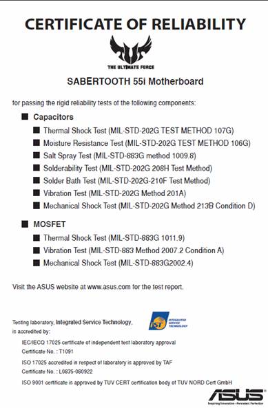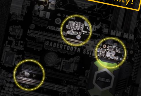 为了确保用户体验无与伦比的性能,SABERTOOTH 55i只选用经过严格测试的高品质元器件,即使在最苛刻的条件下,也可以有完美的表现。举例来说,它所有的电容都经过了热冲击测试,以确保在60℃的变化范围下稳定运行。事实上,它所有的电容和MOSFETs 都已经通过了军工级的使用检定。