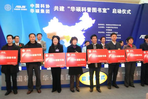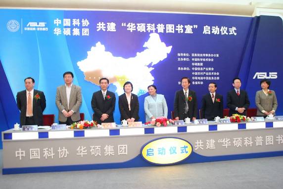 中国科协携手华硕 拟建千城科普图书室 2009年2月20日,“中国科协、华硕集团共建‘华硕科普图书室’启动仪式”在北京人民大会堂举行。中国科学技术协会常务副主席、党组书记、书记处第一书记邓楠,中国科协书记处书记程东红、华硕集团全球董事长施崇棠、副董事长曾锵声出席了启动仪式,国台办交流局局长戴肖锋、中宣部宣教局副局长董俊山等领导,以及来自26个省、自治区、直辖市的科协代表共同参加了此次活动。