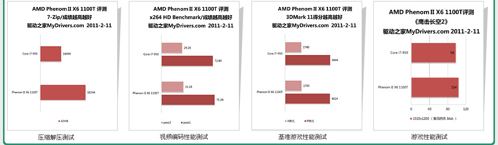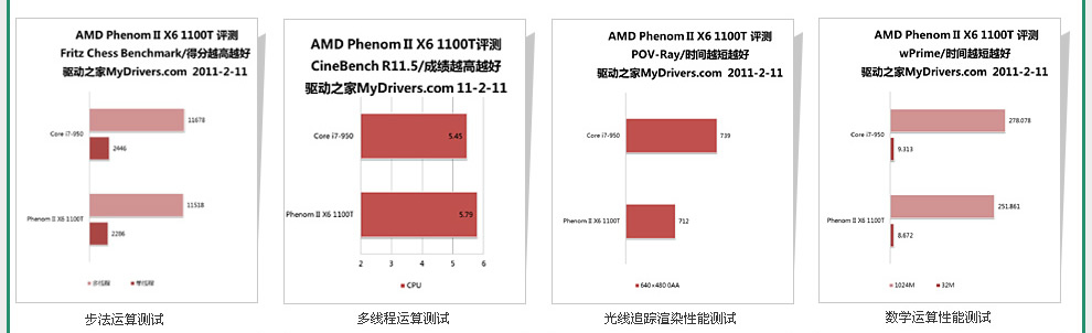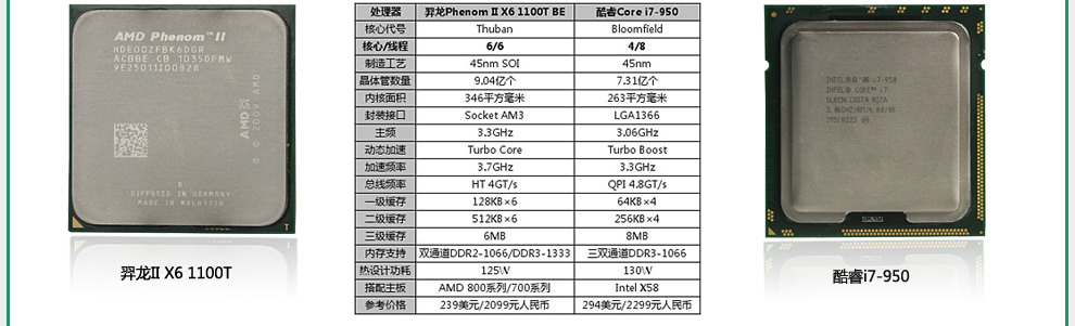 作为AMD六核心处理器中的最高端产品,羿龙II X6 1100T自然也是AMD整个处理器家族中的顶级明星,其原始主频达到了3.3GHz,而且支持AMD独有的多核心动态加速技术Turbo Core,最高3.7GHz。为了对比考验多核心与超线程的执行效率,我们加入了一颗来自Intel的高端四核心Core i7-950,拥有八个逻辑线程,原始主频3.06GHz,也有智能加速技术Turbo Boost,最高3.3GHz。【更多……】